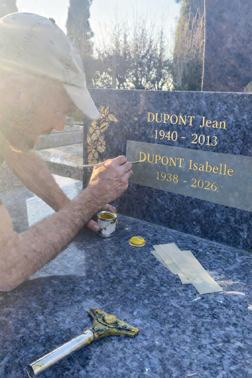 La dorure à la feuille d’or est utilisée depuis des siècles dans l’art funéraire pour mettre en valeur les inscriptions et assurer leur visibilité face aux intempéries.